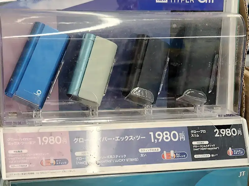 グローの本体は、在庫があれば画像のようにレジ裏の棚に陳列されていることが多いです。