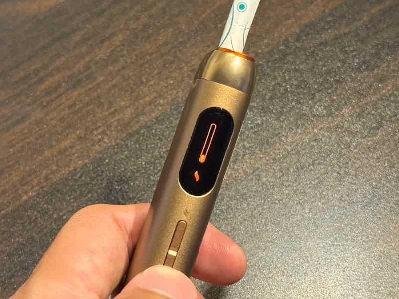 加熱時間終了後に、ブッブッと2回軽く振動し、画面の加熱ゲージがフル表示されるので、スティックをくわえて喫煙を開始します。