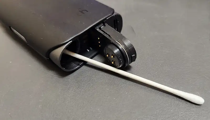 - 本体内側:綿棒を使ってたばこカプセル、リキッド挿入口の中をそれぞれ拭き取る